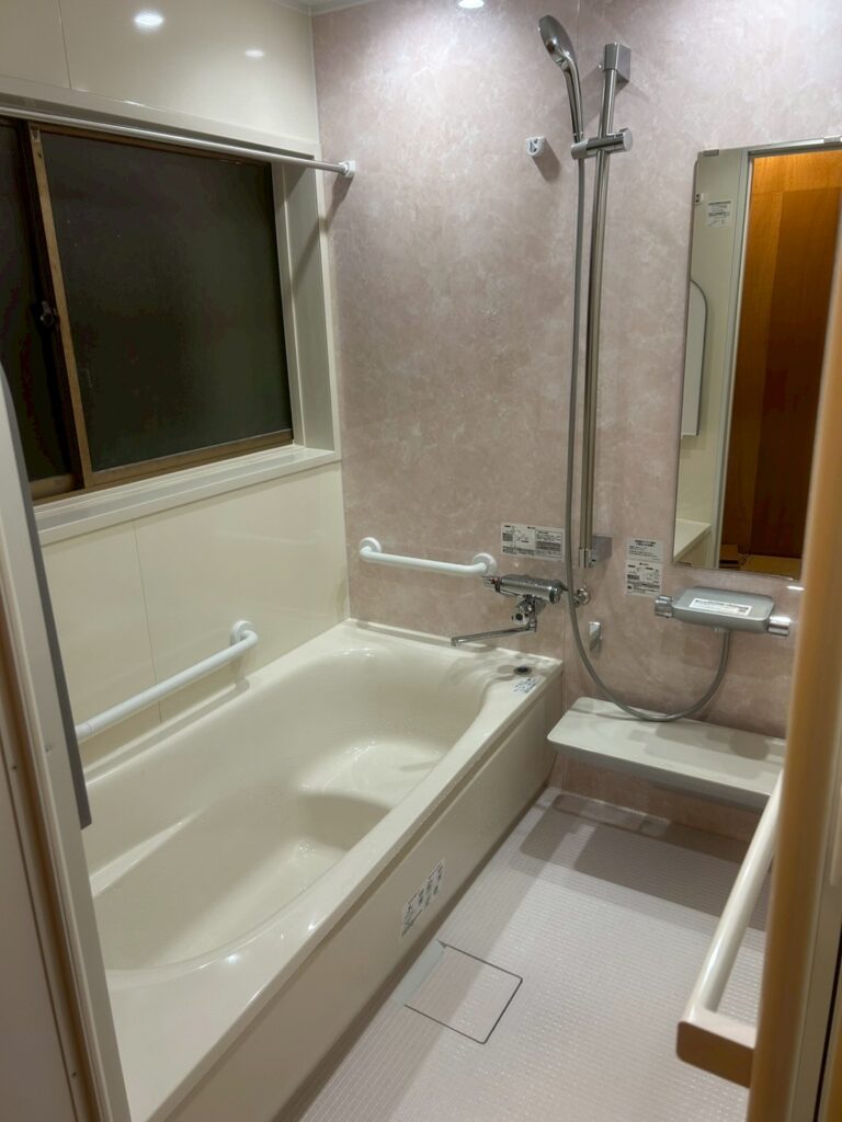 ご年配の方でも安心して寛ぐことができるよう、各所に手すりを設置し、浴室入口の段差も解消。暖かみのある浴室に生まれ変わりました。