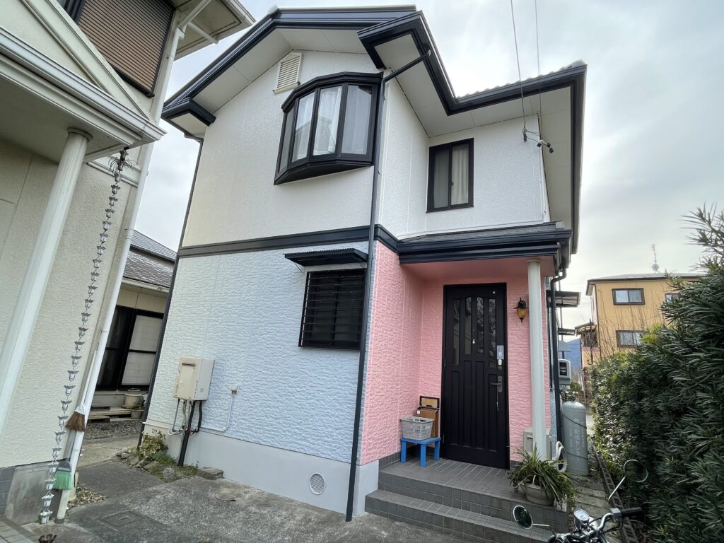 今回は、1階と2階で色分けを行い、立体感を演出。ボウウィンドウや玄関まわりもより引き立ち、モダンな雰囲気に。 また、同じパステル系のお色の組み合わせですが、既存の窓のサッシ枠に合わせて、付帯部分をブラックで引き締めることで、爽やかさと高級感のある、メリハリの利いた外観へと生まれ変わりました。